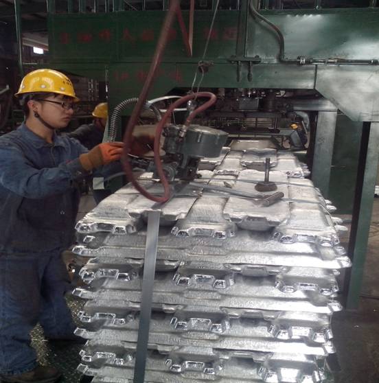 車間工人正在進(jìn)行成品鋁錠打包