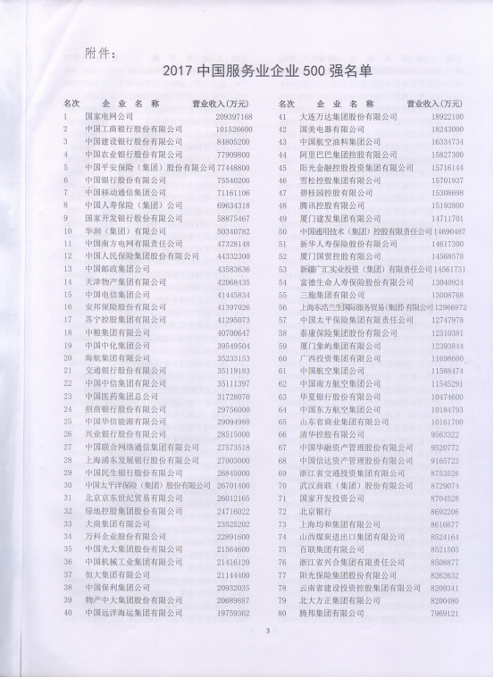 2017年,青海物產(chǎn)在省委、省政府、省國資委的堅強(qiáng)領(lǐng)導(dǎo)和親切關(guān)懷下,在省屬相關(guān)委廳局的熱情幫助和大力支持下,牢牢把握"穩(wěn)中求進(jìn)、改革創(chuàng)新、又好又快"的原則,搶抓機(jī)遇,攻堅克難,扎實工作,保持了營收穩(wěn)步增長的良好態(tài)勢,集團(tuán)再次入圍"2017中國服務(wù)業(yè)企業(yè)500強(qiáng)",排名第397位。