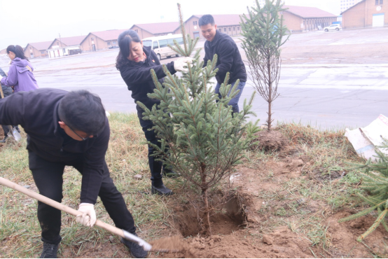 在園區(qū)內(nèi),大家興致勃勃,干勁十足,有的揮鍬挖坑、有的搬運樹苗、有的扶苗培土、有的提水澆灌,經(jīng)過3個小時的忙碌,100棵松柏昂然挺立,呈現(xiàn)出一派生機勃勃的景象。