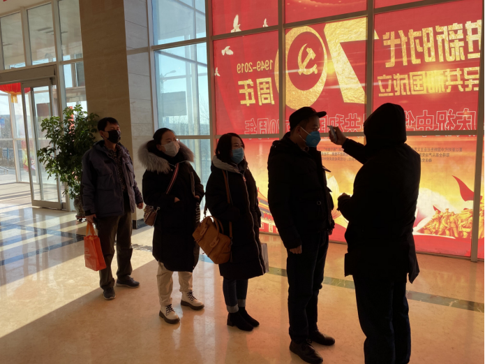 物產化工黨支部黨員堅守防控工作一線,做好體溫測量和消毒工作。?