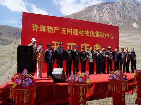 省玉樹地震災后重建現(xiàn)場指揮部指揮長、副省長馬順清宣布建材物流集散中心正式開工并講話。省政府副秘書長巨偉、省經委、省城鄉(xiāng)住房建設廳、西寧市政府、玉樹州政府相關部門、玉樹縣有關負責同志,省物產集團總經理王玉輝、黨委書記白家林、副總經理物產化工公司董事長耿保平等參加了開工儀式。
