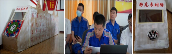 西柏坡精神是部生動的教科書,車間工人黨員袁有德利用平時裝配件的紙盒子,創(chuàng)意性地制做了一列"團結(jié)奮進號"火車,邀請黨員一起乘車前行。袁有德說:"團結(jié)奮進號"列車蘊含著學(xué)習(xí)西柏坡精神,強企富家、團結(jié)奮進的寓意,車頭前面的"大眾"標識代表公司經(jīng)營的品牌;八個綠色的大美孚機油蓋代表八方來財,所有蓋口都向外代表招攬客戶,減少流失,而且像螺絲釘一樣牢牢釘住!車頭車尾標有"勿忘來時路"的字樣,以此提醒廣大黨員干部不忘初心、牢記使命,一定不要忘記來時的路,回顧過去,展望未來,讓"團結(jié)奮進"號列車在西柏坡精神的感召下前行。支部要求,在疫情防控和汽車行車嚴竣的形勢下,我們每一個物產(chǎn)汽貿(mào)員工都是新時代的答卷者,讓"團結(jié)奮進號"奔馳在新時代的征程上,承載著中國夢、物產(chǎn)夢,承載著物產(chǎn)汽貿(mào)職工群眾對美好生活的向往,風(fēng)馳電掣,勇往直前,奔向未來!