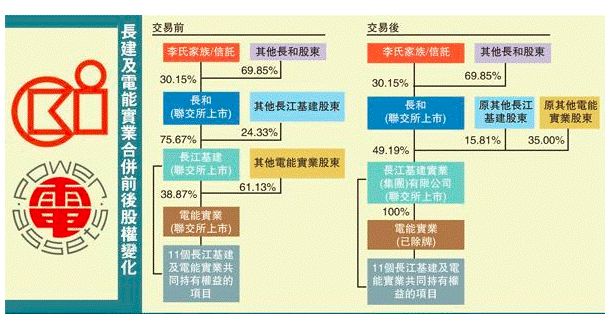 (下圖為長建及電能合并前后的股權(quán)變化,圖片來自香港《文匯報(bào)》)